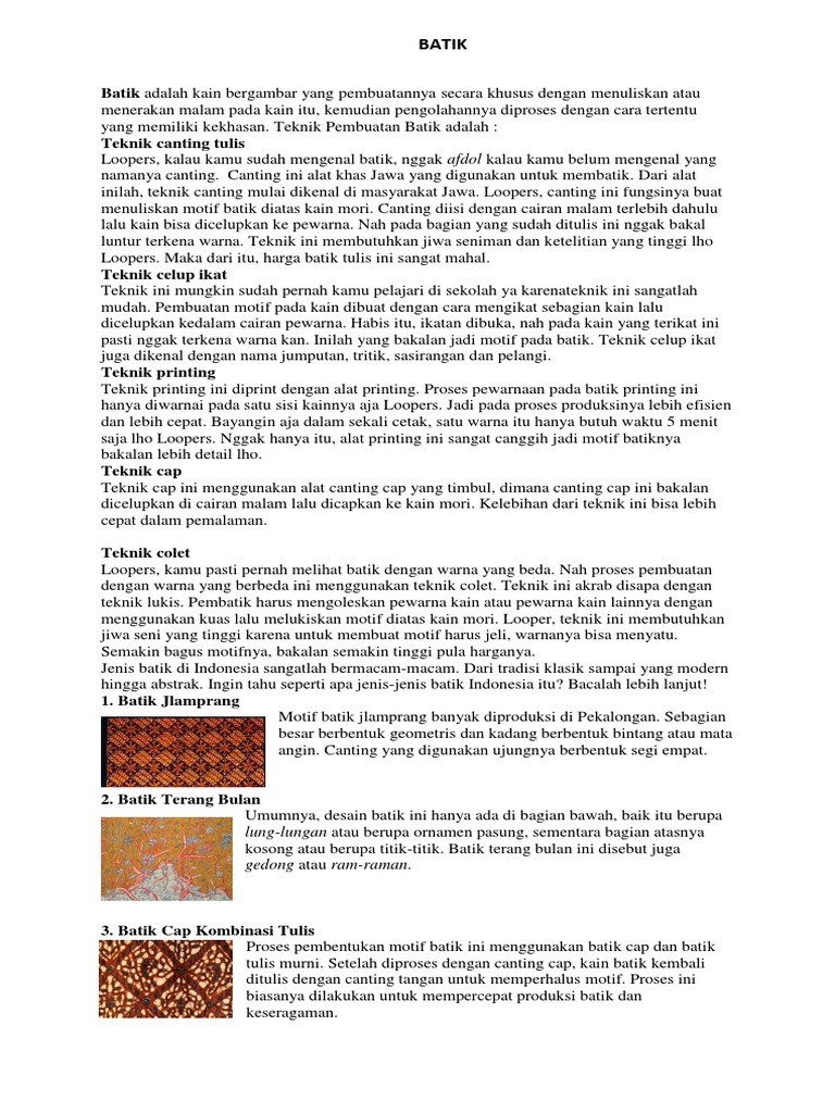 Batik adalah lukisan yang dibuat pada kain mori menggunakan cairan malam atau lilin dan canting sebagai alat untuk membatik.